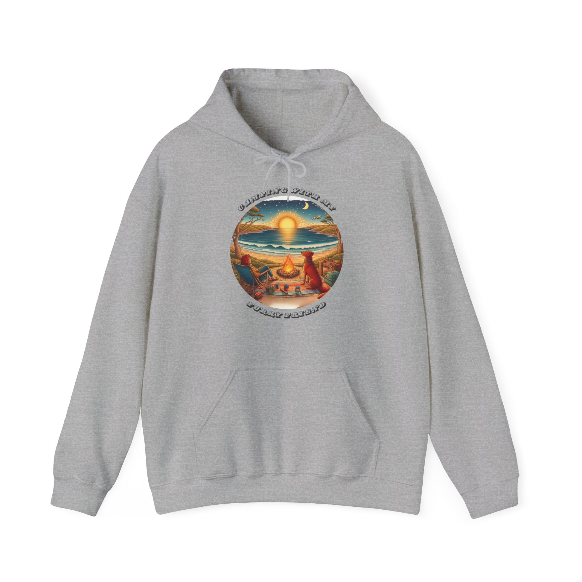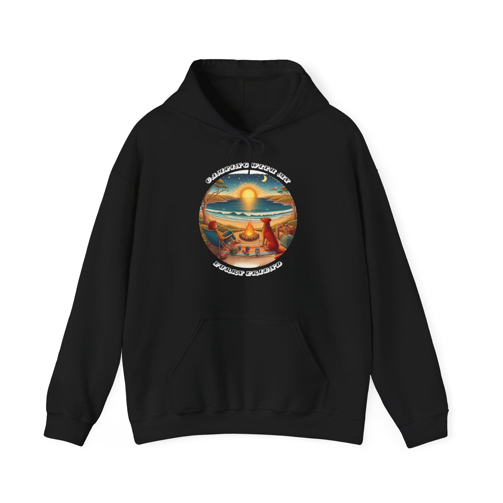 The Camping With My Furry Friend unisex hoodie captures a peaceful coastal campfire scene, where golden light reflects across the water and a devoted dog sits close, taking it all in. It’s a design that celebrates simple moments, shared journeys and the quiet bond between a person and their best mate.