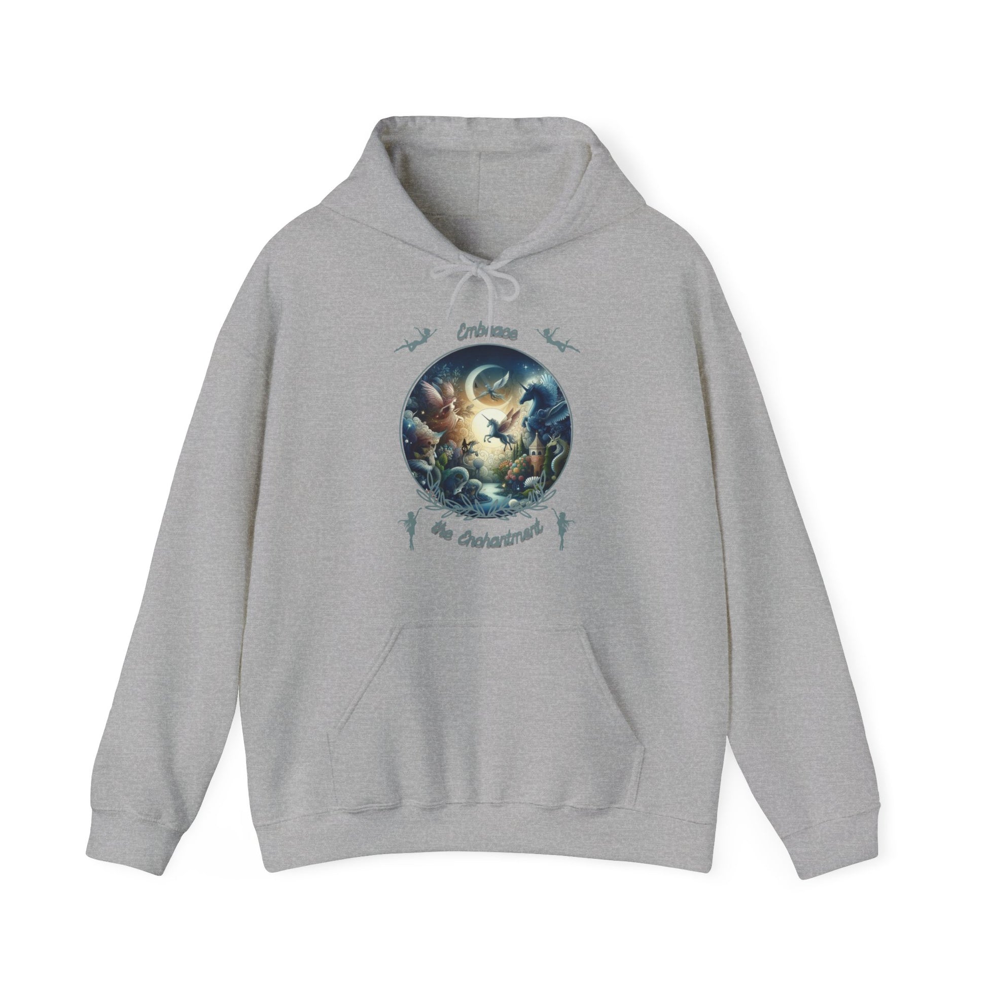 Step into a world of magic with the Embrace the Enchantment Fantasy Hoodie, featuring beautifully illustrated mythical creatures beneath a glowing moon.