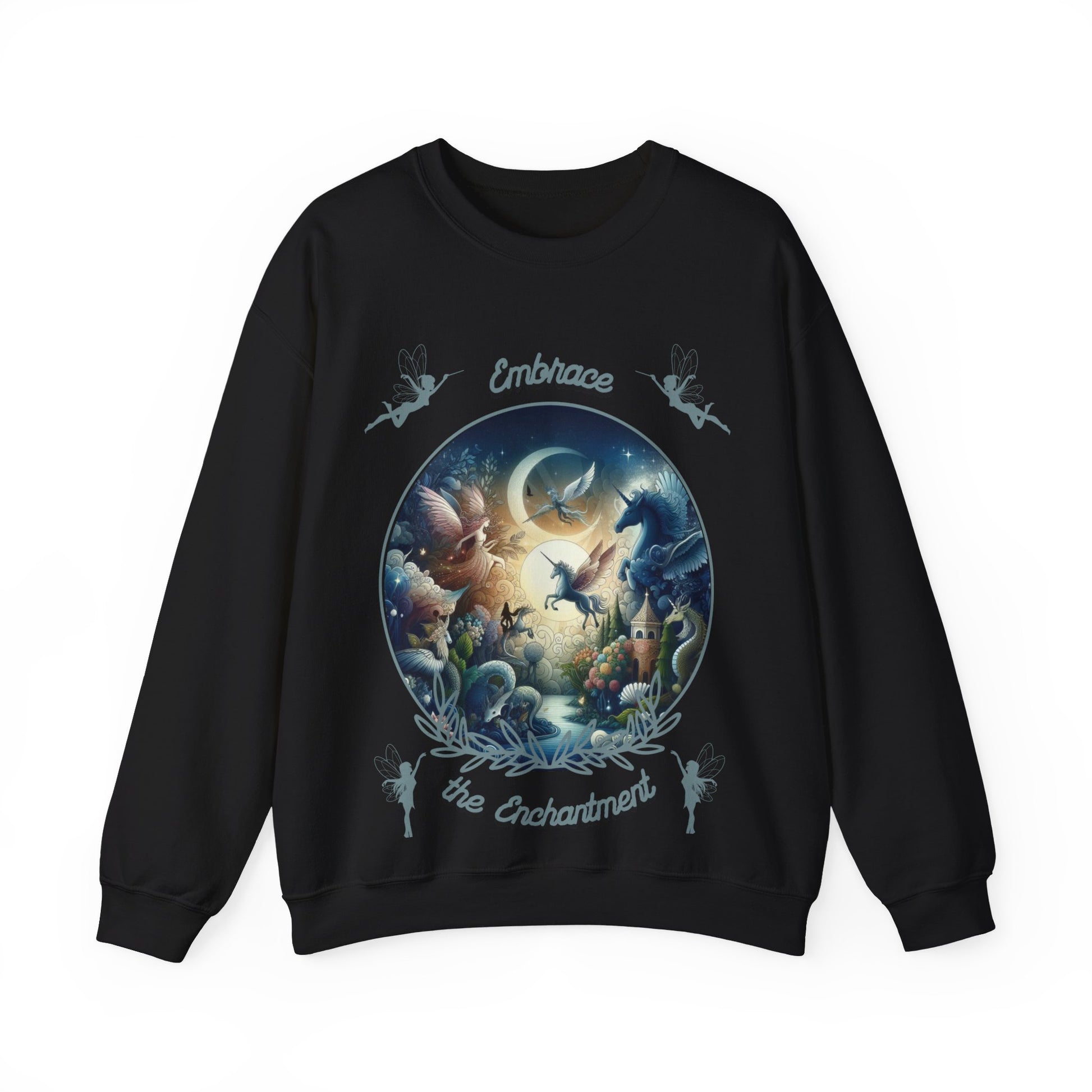 Step into a magical world with the Embrace the Enchantment Fantasy Sweatshirt, featuring beautifully illustrated mythical creatures beneath a glowing moon.