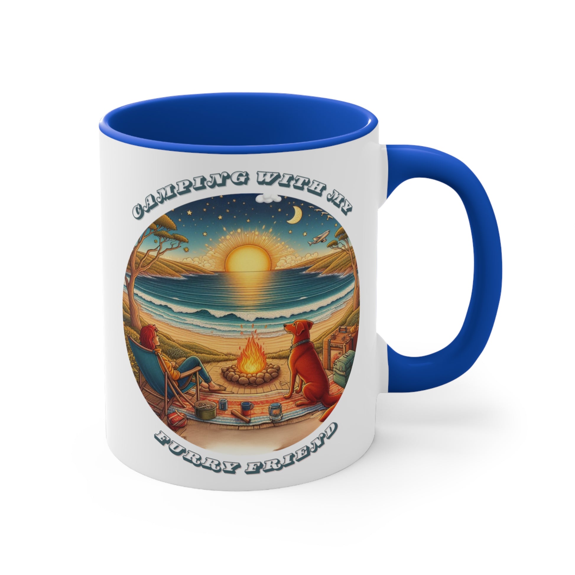 The Camping With My Furry Friend ceramic mug features a peaceful coastal campfire scene, where golden light reflects across the water and a devoted dog sits close, taking it all in. It’s a simple tribute to shared adventures and the bond that makes every getaway better.