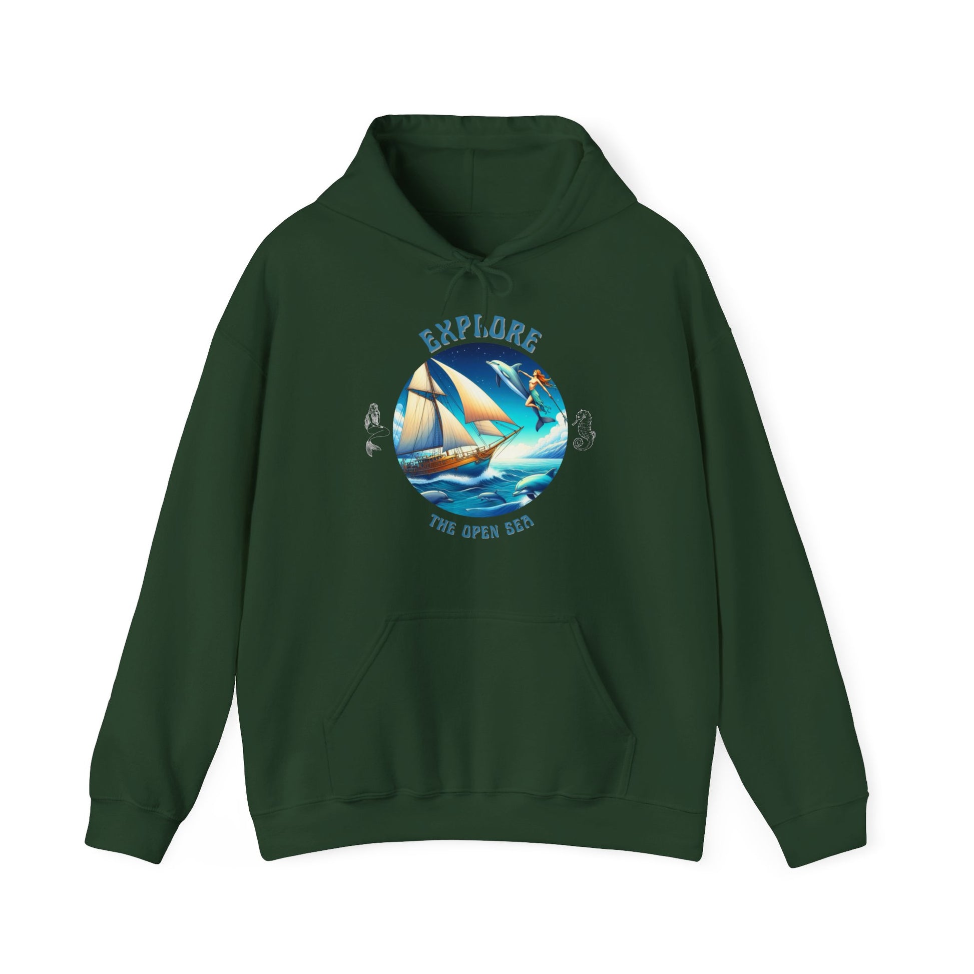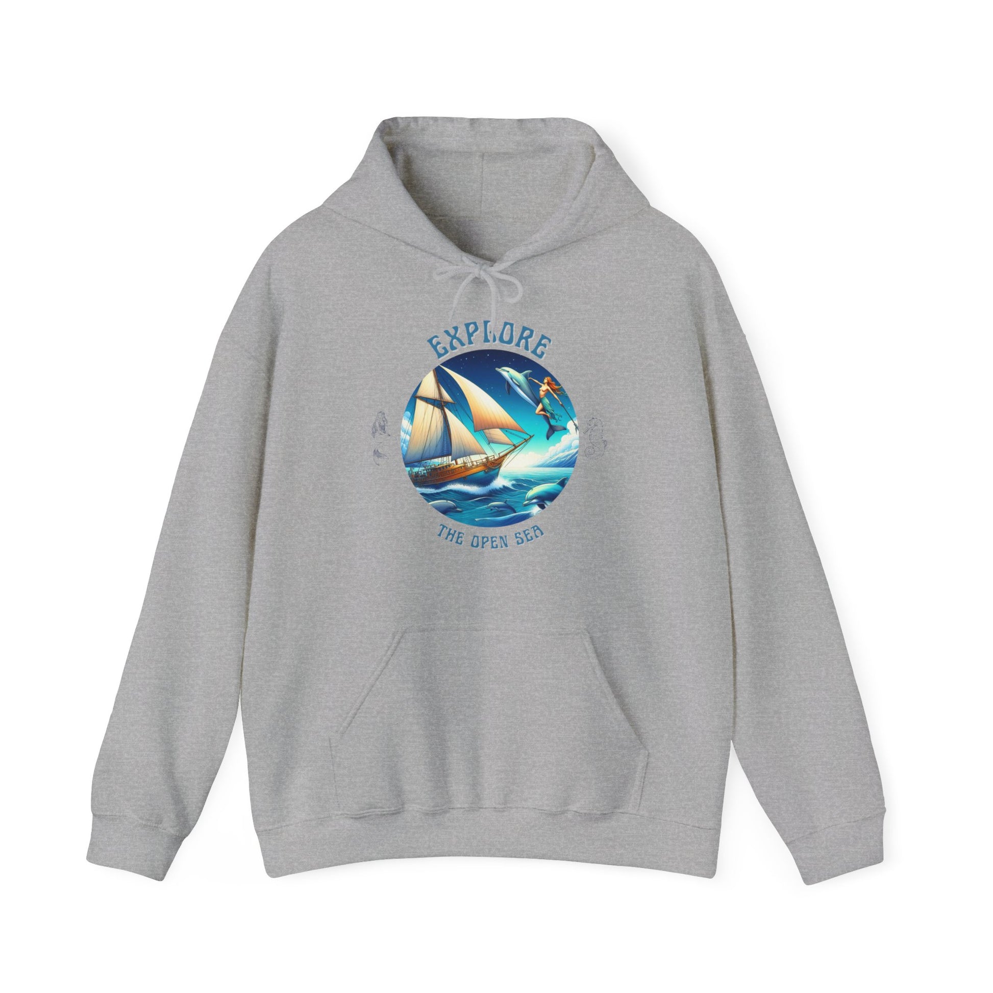 Answer the call of the horizon — even when the wind picks up. The Explore the Open Seas unisex hoodie captures the spirit of maritime adventure with a striking ocean scene featuring a classic sailing ship, dolphins and the freedom of open water.