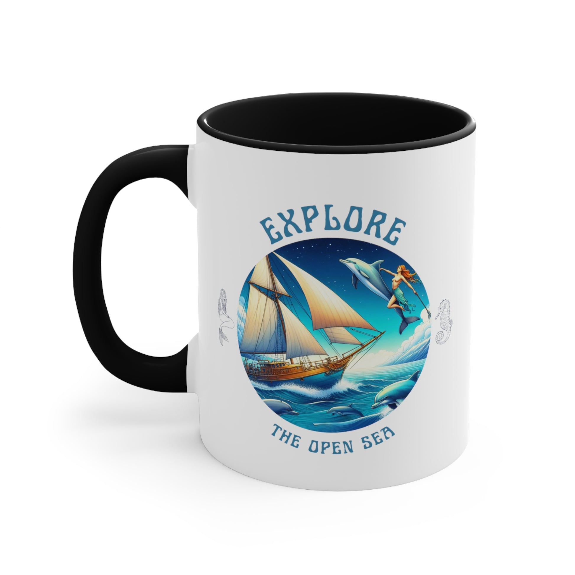 Start your day with the spirit of adventure. The Explore the Open Seas ceramic mug captures the freedom of maritime exploration with a striking ocean scene featuring a classic sailing ship, dolphins and the endless horizon.